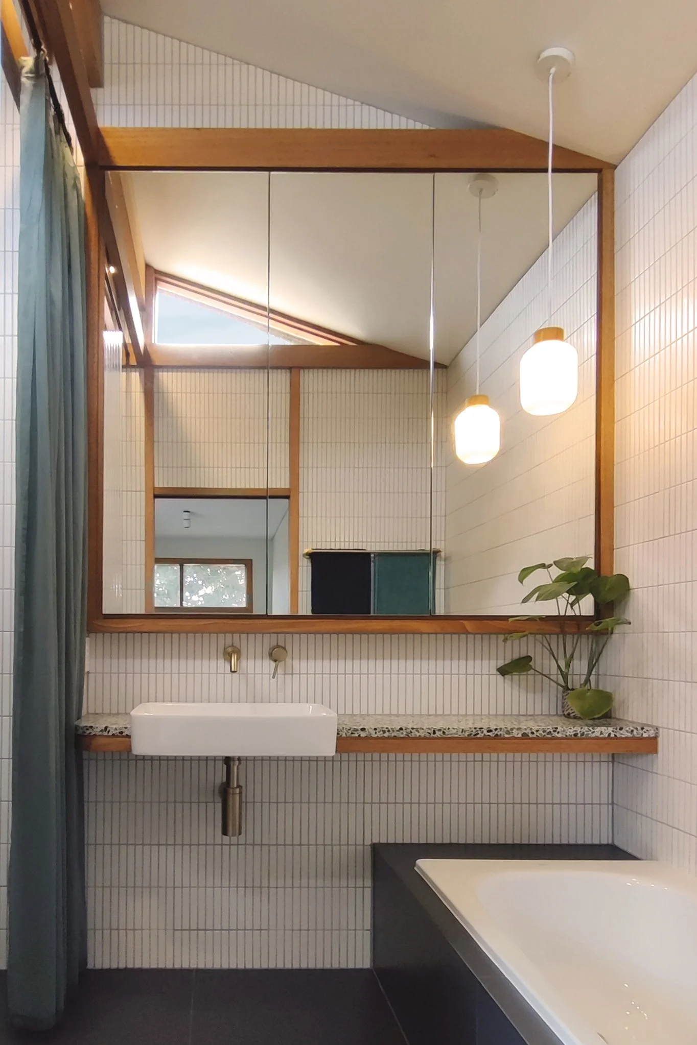 The project’s materiality takes its cues from 1980s architecture, with an emphasis on natural materials such as timber, slate, rendered brickwork and terrazzo. Solid hardwood is a key material used extensively throughout the home, including timber screens, wine racks, shelves, built in desks, day beds and window architraves, resulting in highly textural and crafted interiors.
