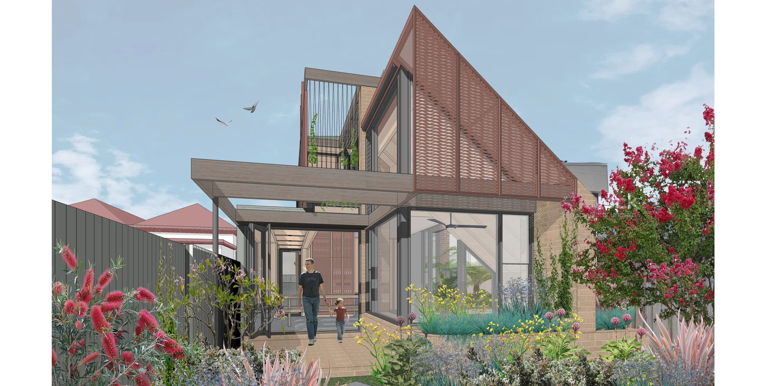 Materially, the Treehouse is a lightweight timber structure perched above a solid masonry base. The textural brick base is nestled into the garden and includes raised planters that establish a seamless relationship between the house and the site’s existing greenery. The space between the solid brick ground floor and the lightweight timber structure is bridged by generous windows that deliver abundant natural light and opportunities for passive ventilation throughout the living areas.